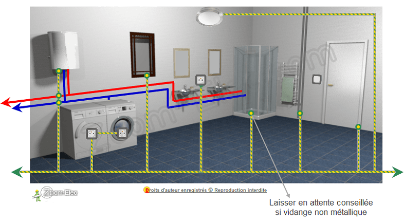 Concernant les prises électriques, il est recommandé d'installer des prises rasoir au-dessus du lavabo, situées à au moins 60 cm de hauteur pour éviter tout contact direct avec l'eau. De plus, toutes les prises doivent être munies d'un dispositif à courant résiduel (DDR) pour assurer une protection supplémentaire. Enfin, veillez à respecter les emplacements autorisés pour éviter des installations risquées.